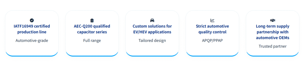 AEC-Q200 certified capacitor solutions for EV/ICE vehicles, BMS, ADAS and infotainment systems.